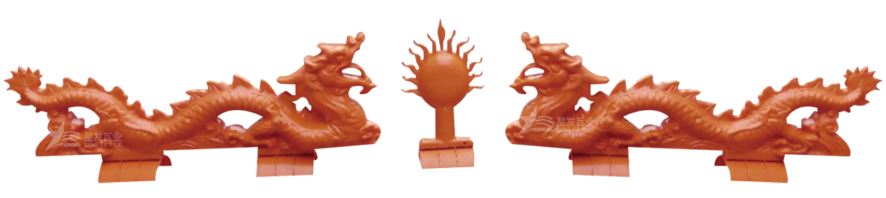 樹脂瓦配件-雙龍玩珠:樹脂瓦屋頂上的裝飾性配件。它們安裝在屋脊的兩端,提供裝飾效果,增添屋頂?shù)娜A麗感。